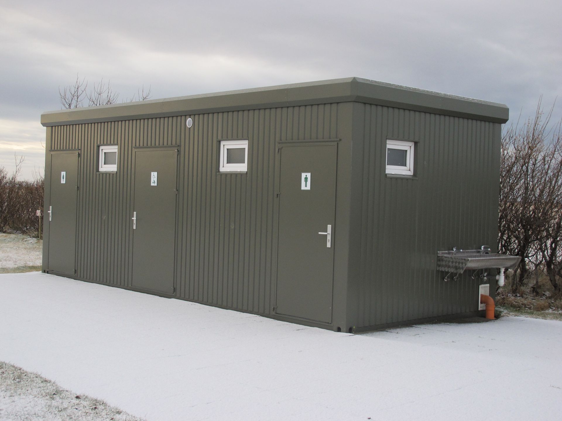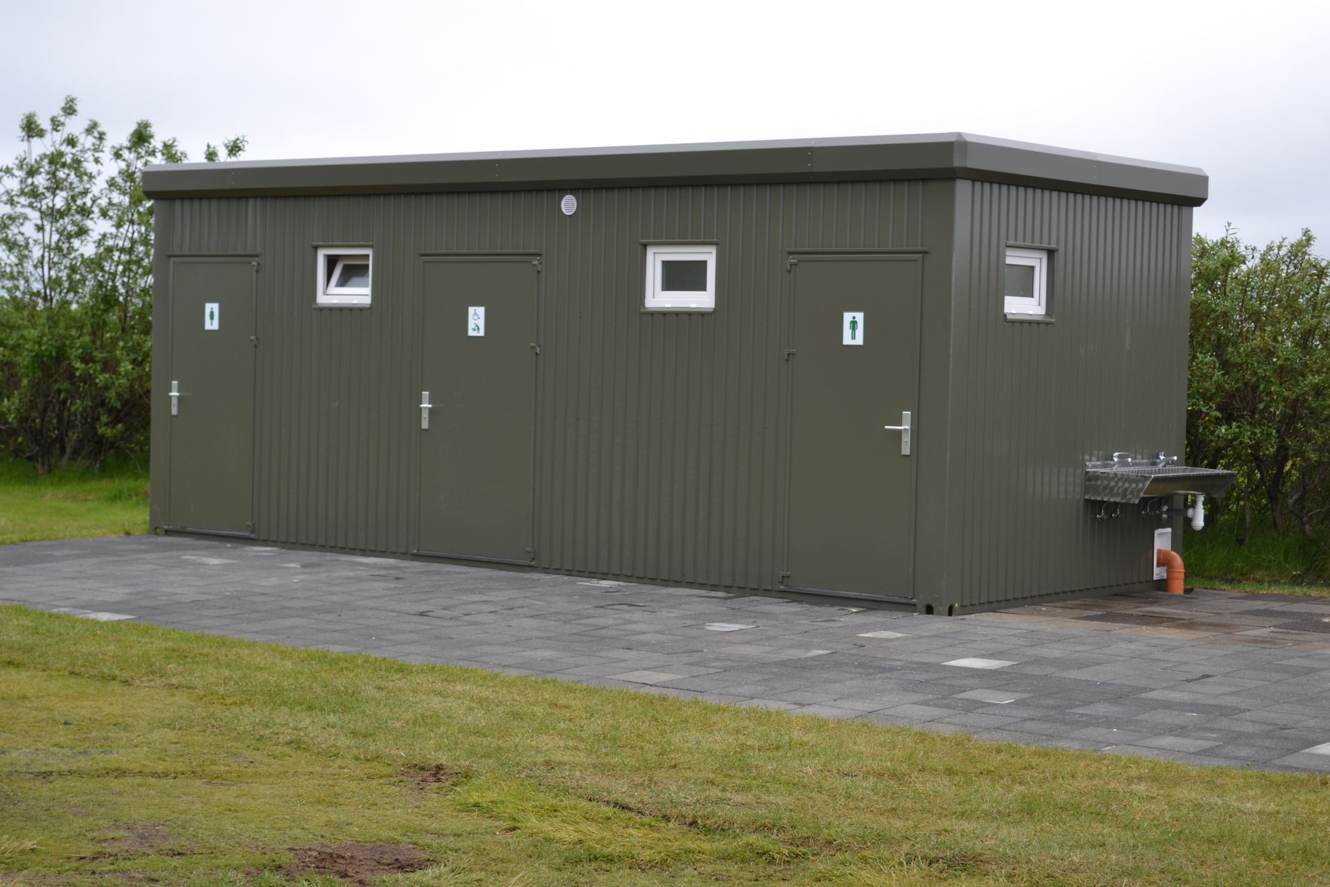 Þetta salernishús hefur verið í fullri notkun við tjaldsvæðið á Hvolsvelli síðan árið 2013. Það er 21 fermetra húseining.
